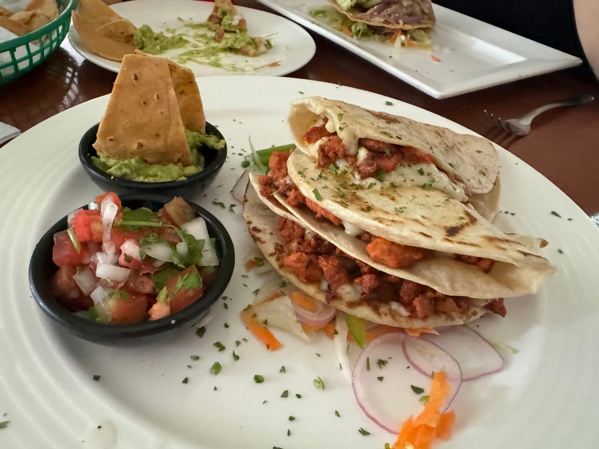 Bug got a shrimp tostada and I got an el pastor quesadilla. We also got a guacamole appetizer that was excellent. It came with three sauces, tamarind, habanero cream sauce, and a chipotle cream sauce.