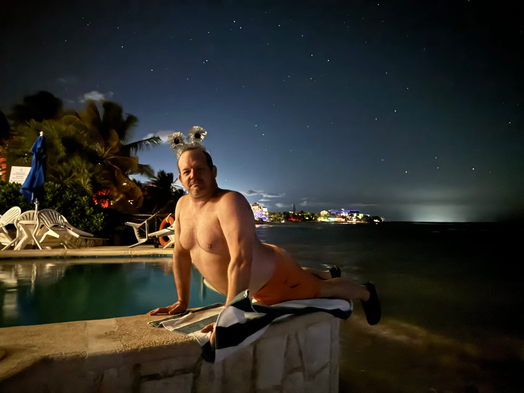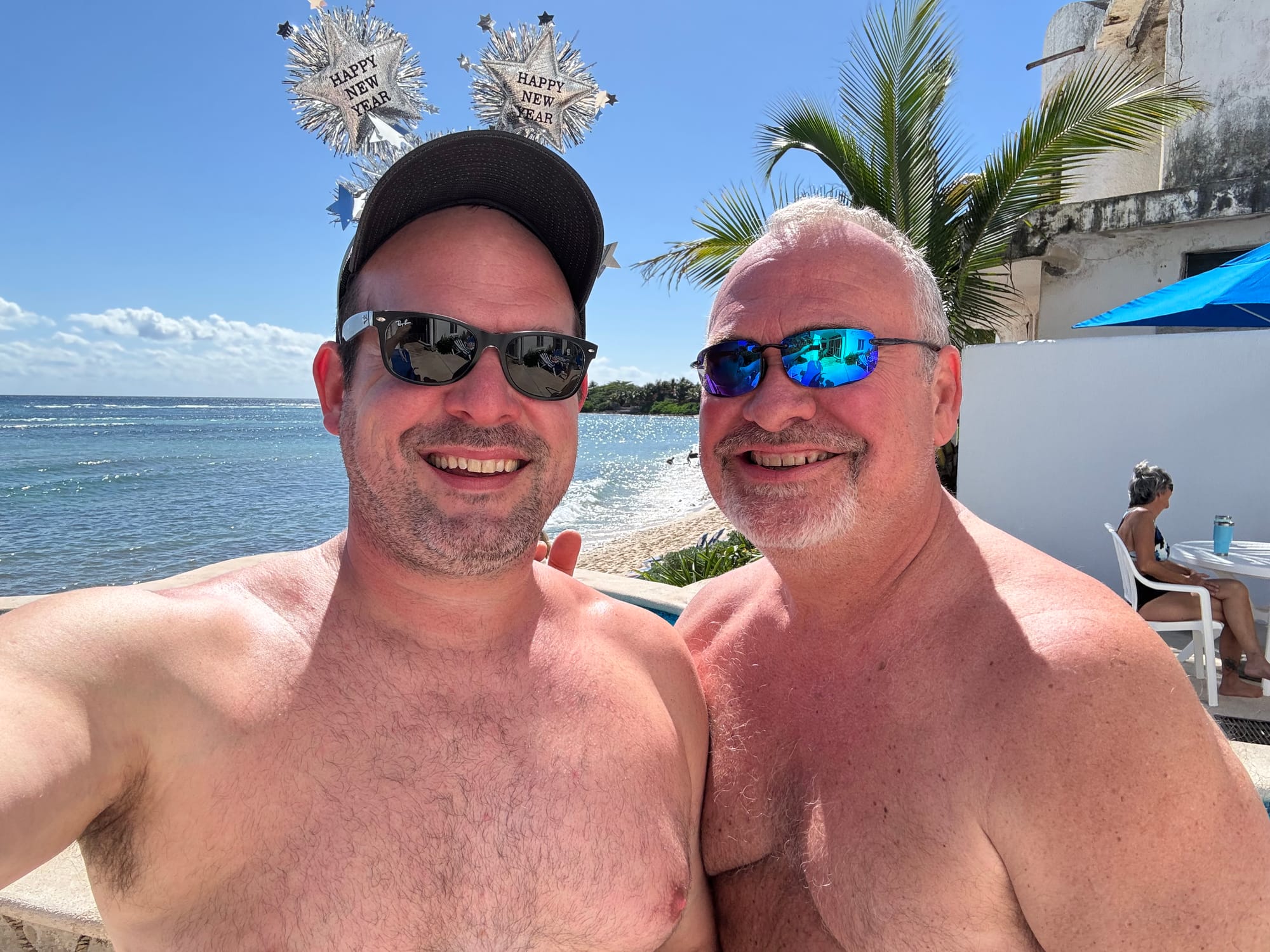 Yesterday we woke up, drank coffee, tried to solve the puzzle, and wrote the blog post. After that we put on our swimsuits and walked around to the front of the building to join whatever party our neighbors were cooking up that we can't see from the back. We entered the courtyard wearing festive New Year's Eve flair.